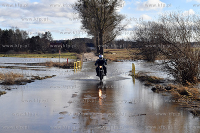 Podtopienia drogi we wsi Sulmin spowodowane wezbraniem wody w rzece Radunia. 20.02.2022. Fot. Konrad Kosycarz / KFP