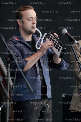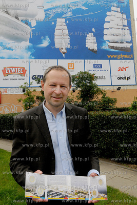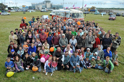 Impreza promujaca budowe kolei metropolitalnej odbyla sie w Gdansku na ul. Slowackiego w poblizu terminalu lotniska, dokladnie w miejscu, gdzie w planach przewidziano budowe przystanku kolejki. Wspolne pamiatkowe zdjecie uczestnikow imprezy, w glebi widoczny zabytkowy autobus jelcz popularny ogorek i...