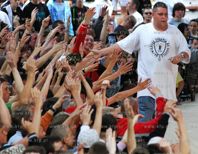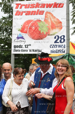 Zlota Gora k. Kartuz. Truskawkobranie to najwieksza na Kaszubach impreza plenerowa - odbywa sie juz od ponad 30 lat, zawsze w niedziele na przelomie czerwca i lipca. Nz. Kaszub czestuje tabaka turystow