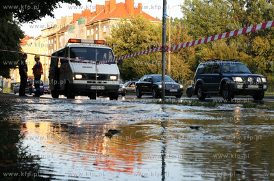 Awaria wodociagu wody pitnej na ul. Kartuskiej w Gdansku. Ledwo w ciagu dnia Saur Neptun Gdansk uporal sie z jedna awaria, pod wieczor kilka metrow dalej zaczela wybijac znowu woda. Po zabezpieczniu podmytego chodnika i zakreceniu wody naprawe uszkodzonego wodociagu odlozono na dzien nastepny.