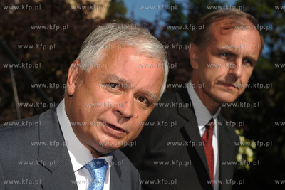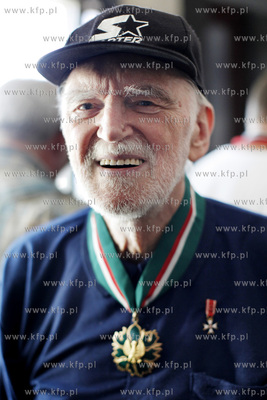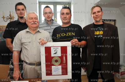 Lech Walesa otrzymal w prezencie plyte z piosenka o sobie pt Lech Walesa, nagrana przez zespol heavy metalowy Holy Smoke z Tczewa. Nz od lewej Lukasz Cholc, Lech Walesa, Jacek Langowski, Rafal Skierka i Maciej Pokrzywa. 19.08.2009 Fot. Maciej Kosycarz / KFP