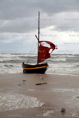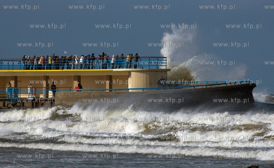 Kolobrzeg. Sztormowa pogoda moze byc rowniez ciekawa aktrakcja turystyczna. Pomimo silnego wiatru i opadow deszczu na plazy w Kolobrzegu mozna bylo spotakc wielu turystow i mieszkancow miasta, ogladajcych sztorm na Baltyku.