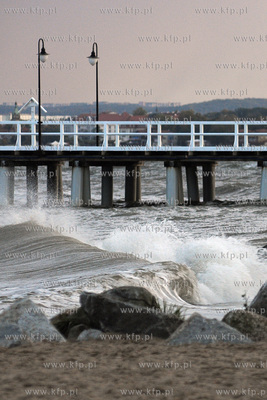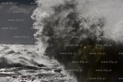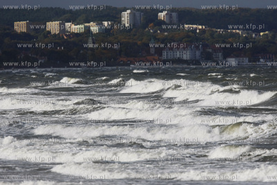Sztorm na Zatoke Gdanskiej. W oddali ponad falami widac Sopot. W nocy spodziawany jest wzrost sily wiatru do okolo 100 kilometrow na godzine. Wiejacy z kierunku polnocno-wschodniego wiatr stwarza powazne zagrozenie dla polozonych nizej terenow. Napierana przez wiatr i wplywajaca do rzek i kanalow woda...