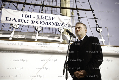 Uroczysty chrzest Daru Pomorza z okazji jubileuszu jego stulecia. Biala Fragata jest obecnie wlasnoscia Centralnego Muzeum Morskiego w Gdansku i pelni role obiektu muzealnego Nz. Prezyden Gdyni Wojciech Szczurek. 10.10.09 Fot.Michal Rumas/ KFP