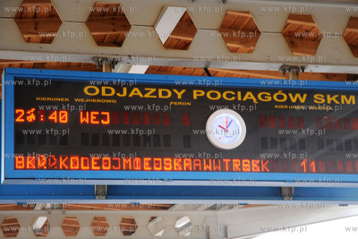 Dworzec kolejowy Gdynia Glowna. Wyswietlacz informujacy o odjazdach pociagow na peronie Szybkiej Kolei Miejskiej pomimo, ze zostal zainstalowany nie tak dawno, bardzo czesto w ostatnim czasie nie funkcjonuje, a jezeli juz pojawiaja sie na nim informacje, to czesto sa trudne do odczytania przez podroznych.