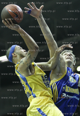Gdynia. Euroleague Basketball .Asseco Prokom Gdynia vs. BC Khimki Moscow Region. Nz David Logan ( Asseco ) i Timofey Mozgov ( Khimki ). 13.01.2010 photo Krzysztof Mystkowski / KFP