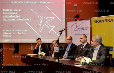 Gdansk. Hotel Mercure. Uroczystosc podppisania umowy na budowe drogi kolowania w Porcie Lotniczym Gdansk z firma SKANSKA. Nz. Prezydent Sopotu, Jacek Karnowski, Jan Zarebski, Prezydent Gdanska, Pawel Adamowicz, Viceprezes SKANSKA, Piotr Sarnowski i Prezes Portu Lotniczego, Wlodzimierz Machczynski 11.01.2010 fot....