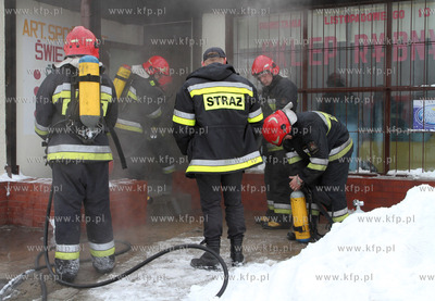 Pozar w sklepie rybnym na Gdanskim osiedlu Morena, ktorego prawdopodobna przyczyna byla nieszczelna butla gazowa. W wyniku grozby wybuchu butli z gazem straz pozarna przeprowadzila ewakuacje pobliskich sklepow 13.01.2010 fot. Sebastian Elijasz / KFP