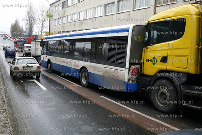Utrudnienia na zjezdzie z estakady na ulice Hutnicza w Gdyni. Na pasie w kierunku Obluza kierowca ciezarowki uderzyl w stojacy na czerwonym swietle autobus. Obrazenia odnioslo 7 pasazerow autobusu i kierowca. Uszkodzone zostaly rowniez dwa pojazdy stojace z przodu.