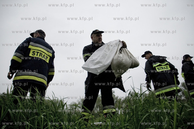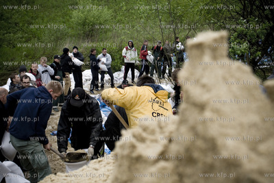 Tyniec. Umacnianie przeciekajacych walow przeciwpowodziowych W akcji biora udzial strazacy, zolnierze,wolontariusze, grupy z zakladow penitencjarnych.