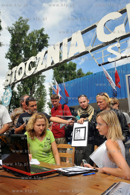 Stocznia Gdanska. Historyna brama nr 2. Wirtualny akt publikacji w wyjatkowej przestrzeni publicznej tablic z 21 postulatami w 30 rocznice ich powieszenia na bramie stoczni podczas strajku. 18.08.2010 fot. Maciej Kosycarz / KFP
