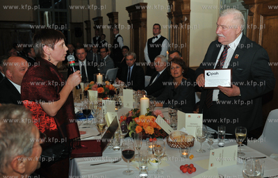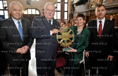 Gdańsk, Dwór Artusa. Janina Ochojska, szefowa Polskiej Akcji Humanitarnej, została laureatką tegorocznej Nagrody Lecha Wałęsy. Nz. Jan Krzysztof Bielecki, Lech Wałęsa, Janina Ochojska i Zbigniew Jagiełło, Prezes Zarządu Banku PKO BP. 29.09.2010 fot. Maciej Kosycarz / KFP