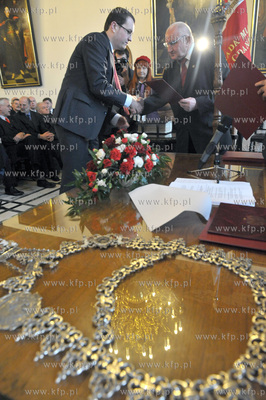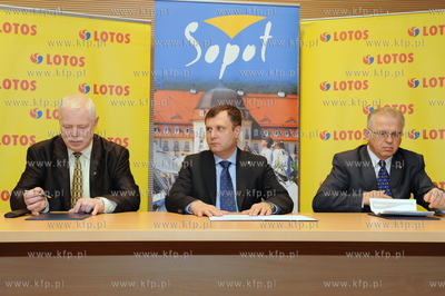 Ergo Arena Sopot/Gdansk. Podpisanie umowy sponsorskiej Trefl Sopot z Lotos Gdansk. Nz. Kazimierz Wierzbicki prezes Trefla, Jacek Karnowski prezydent Sopotu, Marek Sokolowski wiceprezes Lotos Gdansk. 2.12.2010 fot. Jerzy Bartkowski / KFP