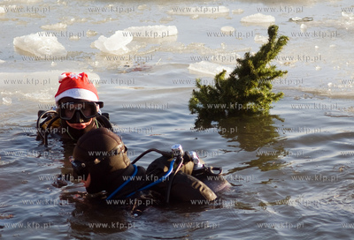 Gdynska Marina. Podwodne ubieranie choinki przez nurkujacych Mikolajow z Centrum Nurkowania i Turystyki "Ticada".Organizatorem imprezy bylo Akwarium Morskie w Gdyni.