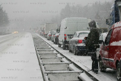 Intesywne opady sniegu byly przyczyna zamkniecia obwodnicy w kierunku Gdanska od strony Chyloni. Nz. samochody stojace w korku na zablokowanej obwodnicy.