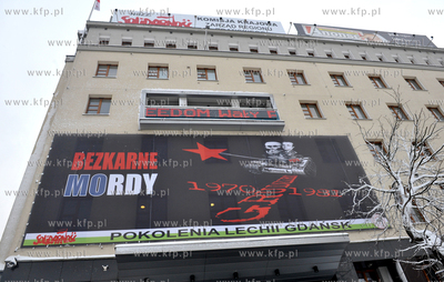 Na budynku NSZZ Solidarnosc w Gdansku zawisl baner upamietniajacy 29 rocznice wprowadzenia stanu wojennego i 40. rocznice wydarzen Grudnia '70. Baner z haslem Bezkarne MOrdy, projektu Roberta Kwiatka, przedstawia czolg kierowany przez generalow Wojciecha Jaruzelskiego i Czeslawa Kiszczaka, rozjezdza...