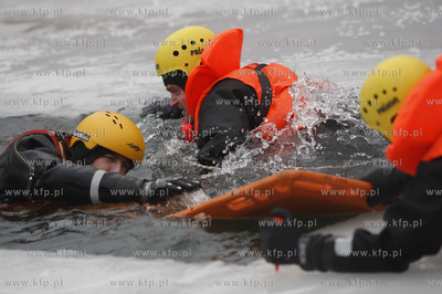 Gdynski Basen Jachtowy. Strazacy Jednostki Ratowniczo - Gasniczej nr 1 Srodmiescie cwicza ratowanie ludzi na kruchym lodzie. 13.01.2011 fot. Krzysztof Mystkowski / KFP