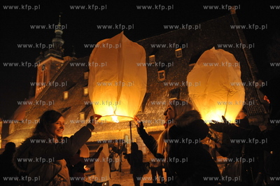 Obchody inauguracji Roku Jana Heweliusza. Happening na Placu Hewelisza przy Korzennej w Gdansku. Jedna z punktow obchodow bylo wypuszczczenie w niebo 400 lampionow. 28.01.2011 Fot. Maciej Kosycarz / KFP