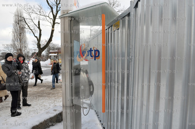 Dla kogo ta budka telefoniczna ? Firma prowadząca rozbudowę Teatru Muzycznego w Gdyni tak zmyślnie postawiła ogrodzenie, że skutecznie uniemożliwia ono skorzystanie z automatu telefonicznego. Chyba, że nurkując pod plastikową obudową. 22.02.2011 Fot. Maciej Kosycarz / KFP