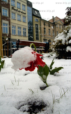 Nietypowa aura w Slupsku. W calym regionie pada snieg. Przysypane sa chodniki i trawniki. Temperatura utrzymuje sie na niewielkim plusie.