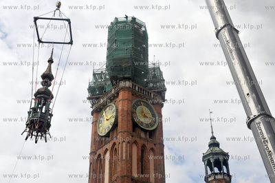 Gdansk. Trwaja prace remontowe Ratusza Glownomiejskiego. Jednym z etapow jest operacja obciecia 15-metrowego helmu wiezy ratusza, przeprowadzona przy uzyciu Zurawia firmy Grohmann. Po renowacji, pod koniec sierpnia, helm, wraz z zdjetym 2 lata temu posagiem krola Zygmunta Augusta, powroci na miejsce.