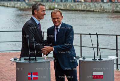 Gdansk, taras Polskiej Filharmonii Baltyckiej. Konferencja prasowa premierow Polski Donalda Tuska i Krolestwa Norwegii Jensa Stoltenberga po podpisaniu porozumienia ws. Norweskiego Mechanizmu Finansowego 10.06.2011 fot. Mateusz Ochocki / KFP