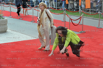 36 Festiwal Polskich Filmów Fabularnych w Gdyni. Gala rozdania nagrod. Scenograf Łucja Sobczak miała wypadek na czerwonym dywanie, pomaga jej dziennikarz prowadzący relacje dla TVP Kultura Lukasz Maciejewski po lewej Krystyna Lubieńska. 11.06.2011 Fot. Maciej Kosycarz / KFP