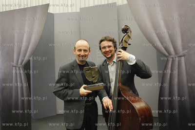 Sopot. XI Festiwal Teatru Polskiego Radia i Teatru Telewizji Dwa Teatry. Uroczysta gala wreczenia nagrod. Nz. Pawel Lysak i Tomasz Obertyn - zdobywcy Grand Prix za sluchowisko Somosierra w rez. Pawla Sztarbowskiego dla najlepszego utworu radiowego.
