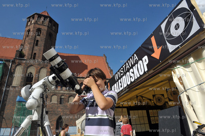 Plac przy kościele św. Mikołaja w Gdańsku. Wystawa Kalejdoskop - Przewrotne Oko. Ekspozycja składająca się z 25 stanowisk prezentujących zjawiska ze świata optyki. Atrakcjami są 2-metrowy kalejdoskop, lustrzany labirynt, teleskopy itp.