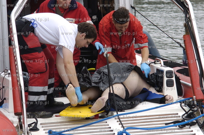 W porcie morskim w Ustce utonął płetwonurek, który naprawiał uszkodzony kadłub jachtu Oceania. Mężczyzna był przez ponad godzinę reanimowany. Nie udało się go jednak uratować. 22.08.2011 Fot. Hubert Bierndgarski / KFP