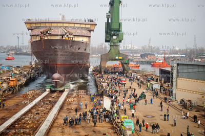 Stocznia Gdańsk. Pochylnia B1. Wodowanie promu pasażersko - samochodowego Stavanger Fjord budowanego dla armatora norweskiego. Statek ma 170 m długości i 27,5 m szerokości. Na swój pokład zabierze 1500 pasażerów i 600 pojazdów.