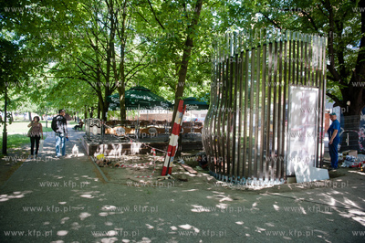 Gdańsk. Plac Dariusza Kobzdeja. Montaż nowoczesnej, automatycznej toalety zaprojektowaną przez pracownie Schleifer i Milczanowski. Kabiny wykonane są z blachy typu korten, która charakteryzuje się rdzawa powierzchnia oraz z siatki z prętów, które miejscami są wygięte tak, by można było przy...
