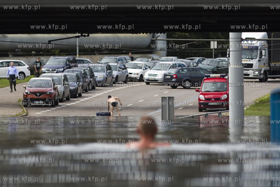 Zalany po obfitych opadach deszczu Węzeł Kliniczna w Gdańsku. Dwaj młodzieńcy wykorzystali okazję i zażywali wodnych kąpieli. Na materacu i wpław. 15.07.2016 / fot. Krzysztof Mystkowski / KFP