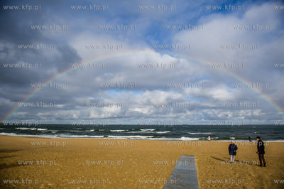 Deszcz i słońce pomalowały dziś w południe niebo dla spacerowiczów przemierzających plażę w Brzeźnie. Jesienna aura sprawiła że nad Zatoką Gdańską pojawiła się okazała tęcza. 30.10.2016 / fot. Mateusz Ochocki / KFP