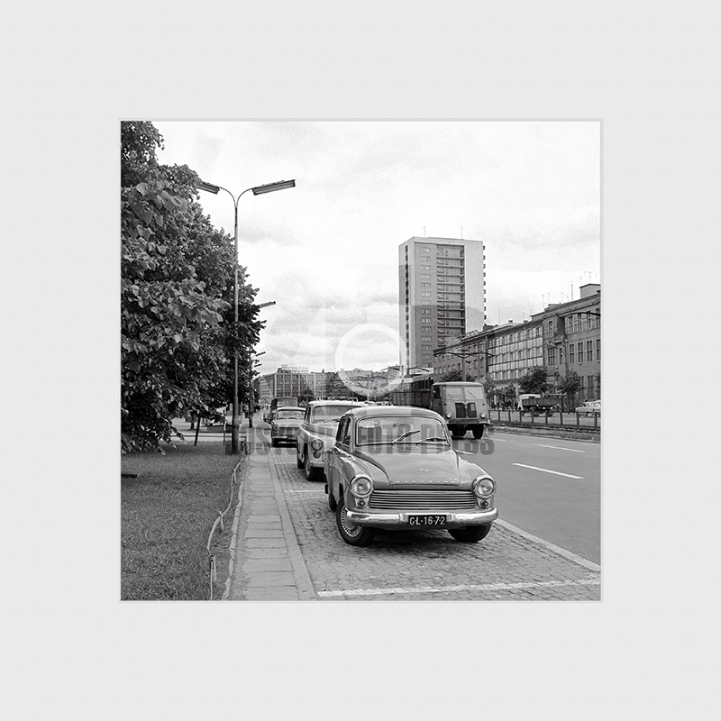 Zaparkowane w handlowej dzielnicy, we Wrzeszczu, wartburg 1000, warszawa 223, syrenka i mijająca je ciężarówka star 25. Rok 1971. Fot. Zbigniew Kosycarz