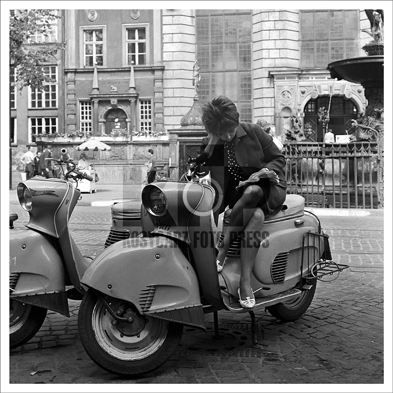 Kobieta, książka i skutery marki Osa. Gdańsk. Długi Targ. Rok 1968. Fot. Zbigniew Kosycarz