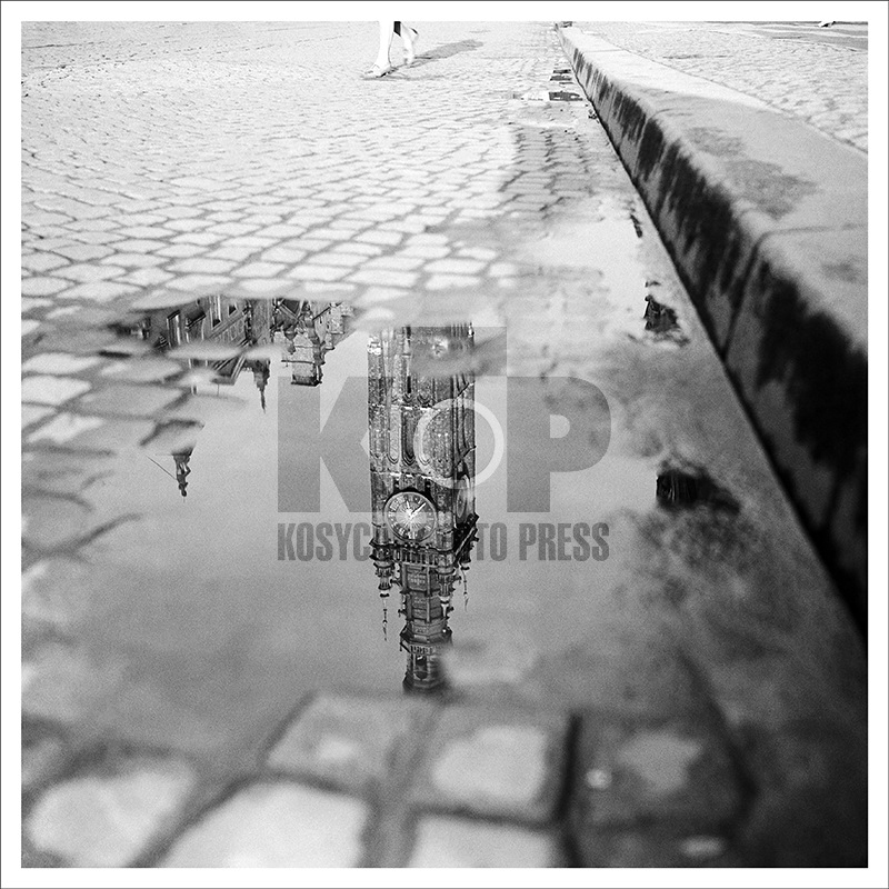 Wieża Ratusza Głównego Miasta w Gdańsku odbita w kałuży na ul. Długiej. Rok 1962. Fot. Zbigniew Kosycarz