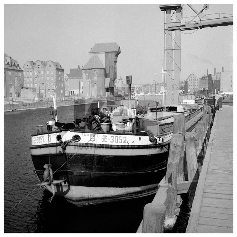 Barka zacumowano na Motławie przy elewatorze zbożowym na Wyspie Spichrzów. Rok 1961