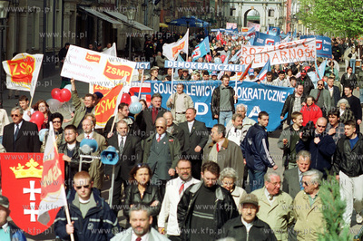Swieto 1 maja w Gdansku. Przemarsz czlonkow SLD i ZSMP...