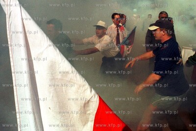 Obchody 1 maja w Gdansku - zadyma pod pomnikiem TYM CO ZA POLSKOSC GDANSKA - Liga Republikanska i Zwiazek Biaslego Orla probowali nie dopuscic pod pomnik delegacji SLD 01.05.2000 fot. Lukasz Glowala / KFP