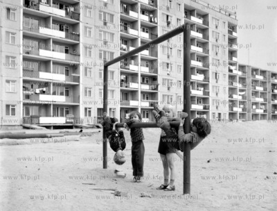 Dzieci na trzepaku przed nowymi domami na ul. Pilotow na osiedlu Gdansk Zaspa. 12.06.1976 2czerwiec76_z.kosycarz_p19 Fot. Zbigniew Kosycarz / KFP ZAKAZ PUBLIKACJI ZDJECIA W INTERNECIE