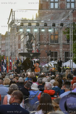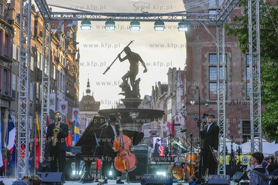 W czwartkowy wieczór Drogą Królewską między Złotą Bramą a studnią Neptuna przeszła Wielka Parada Miast. Na czele barwnego korowodu maszerowały dwie z ośmiu Gdańskich Alegorii – Wolność i Sława. Za nimi podążali żołnierze Garnizonu Gdańsk, dawni strażnicy bram miasta oraz gdańscy werbliści, którzy uroczyście powitali Neptuna. Król mórz wyjątkowo zszedł z fontanny, prowadząc w paradzie postaci ze swojego dworu – nimfy wodne, syreny i koniki morskie. Orszak zamykały postacie charakterystyczne dla ulic dawnego Gdańska – bogaci mieszczanie, straganiarki, kupcy i rzemieślnicy. Artystyczną oprawą spektaklu zajął się Teatr Gdańskiego Archipelagu Kultury. Przy fontannie Neptuna odbyła się oficjalna ceremonia otwarcia zjazdu, której gospodarzami byli prezydent Gdańska Aleksandra Dulkiewicz i przewodniczący Związku Hanzy, burmistrz Lubeki Jan Lindenau. Przed publicznością wystąpił Wojtek Mazolewski Quintet. Pięciu artystów pod przewodnictwem znanego gdańskiego basisty i kontrabasisty zapewniło widzom wyjątkową ucztę jazzową w nowej odsłonie. 14.06.2024 / fot. Paweł Marcinko / KFP