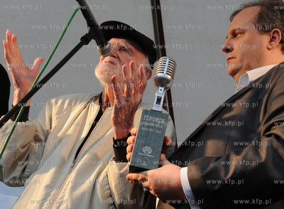 Sopot, ul. Drzymaly. Festyn z okazji 50 lecia powstania kultowego NON STOP w Sopocie, zalozonego przez Franciszka Walickiego w 1961 r. Nz. Franciszek Walicki z Wojciechem Korda. 17.07.2011 fot. Jerzy Bartkowski / KFP