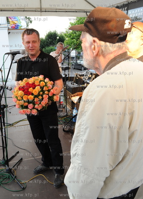Sopot, ul. Drzymaly. Festyn z okazji 50 lecia powstania kultowego NON STOP w Sopocie, zalozonego przez Franciszka Walickiego w 1961 r. Nz. Prezydent Sopotu Jacek Karnowski wrecza kwiaty Franciszkowi Walickiemu. 17.07.2011 fot. Jerzy Bartkowski / KFP