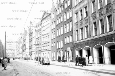 Gdansk ul. Dluga, po prawej wejscie do kina Leningrad ( obecnie Neptun ). na ulicy widoczne tory i slupy trakcji tamwajowe. 1959 (003273) Fot. Zbigniew Kosycarz / KFP ZAKAZ PUBLIKACJI ZDJECIA W INTERNECIE