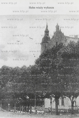 Kserokopia archiwalnego zdjęcia kamienicy przy al. Grunwaldzkiej 2 w Gdańsku z widocznym hełmem na wieżyczce.