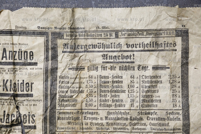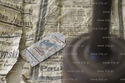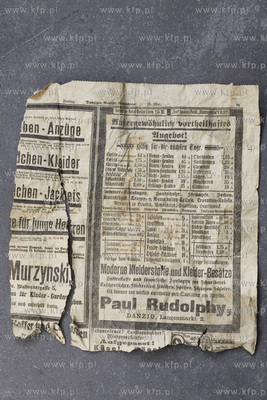 Rzeczy znalezione pod podłogą w czasie remontu kamienicy przy al. Grunwaldzkiej nr 2 świadczące, że budynek nie został wybudowany w 1910 r. jak się oficjalnie uważa, lecz pod koniec XIXw. Nz. gdańska gazeta z końca XIXw.