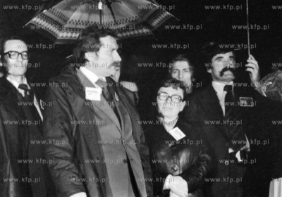 Objazd delegacji Solidarnosci po podkrakowskich miejscowosciach. Autokar ze zwiazkowcami odwiedzil Nowy Targ, Nowy Sacz i Tarnów. Nowy Sacz lub Tarnow (?) Na zdjeciu m.in.: Lech Walesa i Anna Walentynowicz 19.10.1980 fot. Leszek Biernacki / KFP