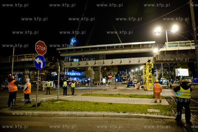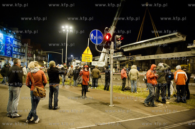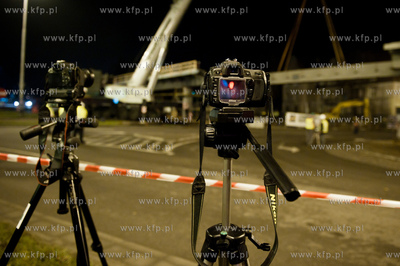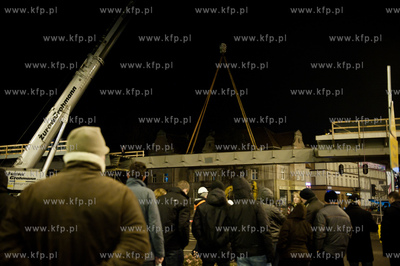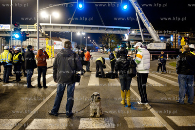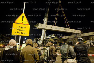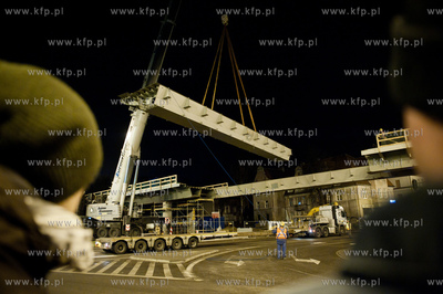 Gdansk - Wrzeszcz. Montaz ostatniego elementu estakady nad ulica Grunwaldzka przy skrzyzowaniu z ulica Slowackiego. Zamontowana zostala sekcja B. Budowany odcinek bedzie czescia trasy Slowackiego. 18.11.2011 fot. Mateusz Ochocki / KFP