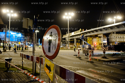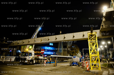 Gdansk - Wrzeszcz. Montaz kolejnych elementow estakady nad ulica Grunwaldzka przy skrzyzowaniu z ulica Slowackiego. Zamontowana zostala sekcja D laczaca postawione już dwie czesci estakady. Budowany odcinek bedzie czescia trasy Slowackiego.